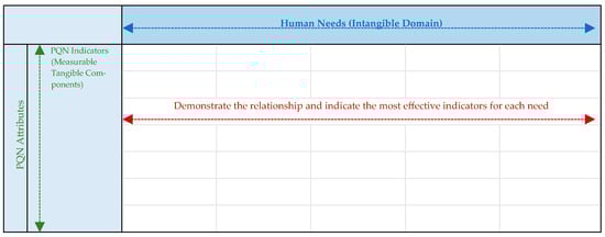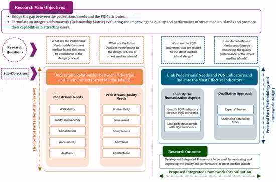 As a result, the main objective of the research paper is to bridge the gap between the pedestrians’ needs and the PQN attributes by formulating an integrated framework (Relationship Matrix) that shows the most effective indicators for each attribute that contribute to achieving pedestrian needs. The proposed integrated framework is designed to be used in evaluating and improving the quality and performance of wide street median islands and promote their capabilities in attracting users (Figure 1). Considering this integrated framework in the design early stages will help in creating responsive and friendly street median islands that encourage walkability and generate social sustainability.