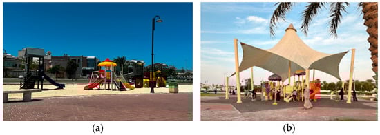 Figure 7. Space organized for social activities: (a) BBQ grills, (b) Single seats and Group Pergolas. - Accessibility Needs: Accessibility in street median islands is essential to ensure inclusivity, particularly for individuals with disabilities, the elderly, and children. These groups are especially sensitive to design flaws, as inadequate accommodation can significantly impact their safety and ability to navigate inside the street island [60,65]. In 2010, King Salman Center for Disability Research issued the Universal Accessibility Built Environment (UABE) Guidelines for the Kingdom of Saudi Arabia that evaluate and benchmark the existing level of universal accessibility within KSA against acceptable standards and international best practices in four areas: built environment, land transportation, marine transportation, and destination and accommodation. However, during the site visits, the researcher noted that not all street median islands meet ADA needs. In addition, the height of some pavements is higher than it should be, which makes it hard for people with disabilities to use these spaces. Accordingly, urban designers must prioritize universal design principles when planning and organizing street median islands. This includes incorporating features such as wide and well-maintained pathways, ramps with a minimum width of 1.2 m and a slope of no more than 5%, and clear signage for ease of navigation. Moreover, urban designers should consider the shortest and most direct routes to activity areas, ensuring that essential facilities like seating, shade, and safe crossing points are readily accessible [66]. By integrating these elements, street medians can become safe, inclusive, and functional spaces for all users, fostering equal participation in urban life.