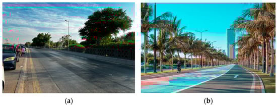 The Kingdom of Saudi Arabia (KSA) is one of the largest countries in the Gulf region that is undergoing a remarkable urban transformation along its main cities (Riyadh, Jeddah, and Dammam) through its Vision 2030, which seeks to enhance the quality of life for its citizens and position its cities among the top 100 most livable globally [4]. One of the Vision initiatives aims to repurpose street median islands into linear, active parks. Traditionally underutilized and often neglected, these median islands are being redesigned as green spaces that offer recreational areas, pedestrian pathways, and aesthetic value, contributing to healthier and more vibrant urban environments [5,6].
