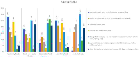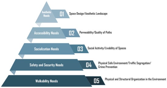 Addressing users’ needs requires understanding the interplay between humans and their surroundings. Maslow’s hierarchy pyramid of needs offers a framework for this understanding, categorizing human needs into five levels: walkability, safety and security, socialization, accessibility, and aesthetics (Figure 5) [53].