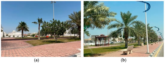 Street median islands or pedestrian median refuges are designed as safe and comfortable zones for pedestrians crossing multi-lane roads. Furthermore, they are considered one of the main linear urban spaces that shape any city, improve its visual image, and boost its public services [1]. Due to the limitation of green areas in the Gulf region, many countries have striven to maximize the use of available green spaces, including wide pedestrian islands, to enhance walkability and improve urban environments. These pedestrian spaces often serve dual purposes: providing safe and comfortable zones for crossing multi-lane roads while also acting as green oases that contribute to the city’s aesthetic appeal and environmental sustainability [2,3]. In addition, these urban spaces can also contribute to adding a distinctive social and environmental depth to urban communities.