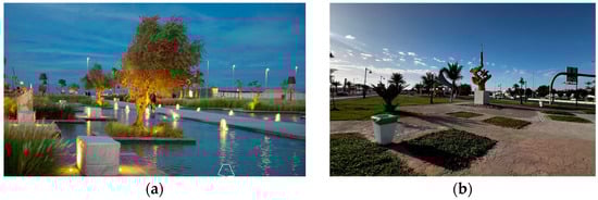 - Aesthetic Needs: The aesthetic need in street median islands refers to the human connection to the visual and emotional appeal of the surrounding urban environment [67]. This perception of beauty and satisfaction is subjective, varying from one individual to another, and is influenced by elements such as artistic features and thoughtful design [68]. While natural and visually striking elements play a role in creating aesthetic appeal, true beauty emerges from adhering to key design principles. These principles include the organization and logical arrangement of landscape components, which foster harmony, diversity, and cohesive integration, giving space a unique identity. Achieving unity, proportionality, balance, rhythm, sequence, and consistency in design enhances the visual experience, contributing to the overall sense of place and character [69]. Jeddah city is known by its visual appearance, where aesthetic elements are added to most of its street median spaces or squares, giving it a unique identity (Figure 8). Furthermore, incorporating diverse textures, colors, lighting, and interactive elements can further enrich the aesthetic value of street median islands, making them not only visually appealing but also engaging and inviting for the community [70].
