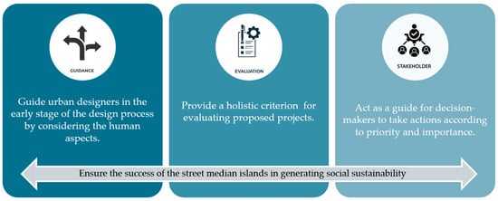 Accordingly, users’ needs should be integrated into the design process of the street median islands at early stages due to their importance in enhancing the social, health, and psychological well-being of humans [48]. Effective design for street median islands requires a careful understanding of pedestrian needs, which can vary based on cultural and social backgrounds [49,50] A successful design fosters these principles by creating responsive environments that facilitate social integration and improve the quality of life for all community members. Polese and Stern note that social sustainability aims to enhance environmental connections and sociocultural interactions, ensuring inclusivity and cohesion among diverse population groups [51]. Sobri and Sulaiman emphasize that community participation and collaboration with local institutions are critical to developing pedestrian-friendly and high-quality street median islands [52]