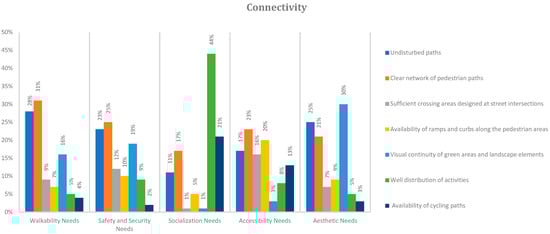 - Connectivity: This reflects the extent to which the pedestrian environment is linked to the context and street networks [77]. This approach focuses on functional and visual continuity, allowing for seamless integration with the surrounding environment that affects user perception and contributes aesthetic value to the environment [78]. Well-connected networks make walking easier and more efficient. Some indicators should be considered when designing pedestrian networks to ensure their connectivity, such as the following: