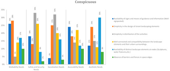 - Conspicuous (attracting notice or attention): This means the extent to which the pedestrian environment is clear, distinct, and easy to perceive [79]. It refers to the ability of pedestrians to identify the spatial structure of urban space and the degree of clarity determined that facilitates the navigation of it [80]. Physical features are used as reference points that help in improving legibility and provide pedestrians with a sense of orientation. To enhance the degree of clarity of the pedestrian environment, some attributes should be considered, such as the following: