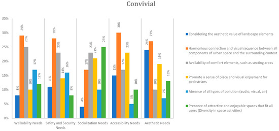 - Convivial: This refers to what extent the pedestrian environment on the street appears enjoyable, livable, fosters social interaction, and provides opportunities for people to gather, meet, and enjoy their environment [81]. A livable street should be rich in pedestrian-oriented infrastructure. Vibrant street median islands should have a variation of activities, and they should be well distributed among them. Furthermore, the design should allow pedestrians to walk freely, enjoying their stay and feeling safe. Some indicators should be considered when designing pedestrian networks to ensure their conviviality and contribute to pedestrian enjoyment [82], which are the following: