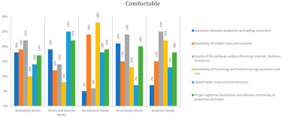 - Comfortable: This means the extent to which the pedestrian environment is pleasant and easy to use, offering protection from weather or any danger. The design of such median islands should provide an easy and comfortable experience for all types of pedestrians of diverse physical capabilities [83]. It should assess the ease of use, pleasure, safety, and welcoming nature of this environment for pedestrians. Comfort encompasses various dimensions, encompassing physiological and psychological aspects [84]. These aspects include climatic comfort, visual comfort, and auditory comfort. A set of indicators can affect the degree of comfort and support achieving it, such as the following: