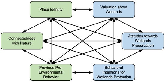 We investigated two groups of variables. The first group comprised wetland-specific variables: valuation/knowledge about wetland importance, attitudes towards wetland preservation, and behavioral intentions for wetland protection. The second group included general environmental and place-based variables: local identity (encompassing place attachment and regional identity), nature connectedness, and previous pro-environmental behaviors.