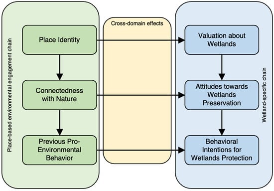 Beyond these general correlations, we proposed a theoretical model distinguishing between predictor and outcome variables, suggesting several causal chains and cross-domain effects. We hypothesized a wetland-specific causal chain where valuation/knowledge about wetland importance would influence attitudes towards wetland preservation, which, in turn, would affect behavioral intentions for wetland protection. For the general environmental variables, we proposed a causal chain linking local identity to nature connectedness, and subsequently to previous pro-environmental behaviors. We also expected significant cross-domain effects, with general environmental variables influencing wetland-specific outcomes. For instance, we anticipated that previous pro-environmental behaviors would predict behavioral intentions for wetland protection, nature connectedness would predict attitudes towards wetland preservation, and local identity would predict valuation/knowledge about wetland importance.