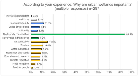 Participants were asked about the importance of urban wetlands. Responses were grouped following the literature into three categories (Figure 3). Results show intrinsic valuations; in particular, “biodiversity conservation” were highly recognized for most people. This was followed by intrinsic valuations, including “air and water purification”, “tourism” and “recreation and sports” among the most mentioned. Relational valuations included “inspiration/beauty”, “a sense of well-being” and “spirituality”.