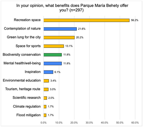 When asked about the specific benefits of each of the two urban wetlands officially declared, responses tended to vary. María Behety Park (Figure 4) was mainly valued for utilitarian reasons, especially as a recreation space, for being a green lung for the city and a space for sports. Relational values follow, mainly contemplation of nature and mental health/well-being. Biodiversity conservation was mentioned by nearly 12% of participants, which is interesting considering that the question is aimed at personal benefits.