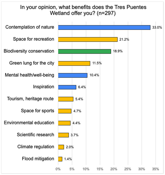 In the case of Tres Puentes (Figure 5), contemplation of nature is the most mentioned, along with mental health/well-being and inspiration expressing a higher relational valuation of this ecosystem. Utilitarian views are included in the second most mentioned benefit “space for recreation” and “being a green lung for the city”. Biodiversity conservation was mentioned by nearly 19% of participants.