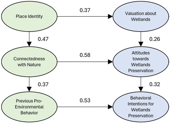 Examination of the factor correlations in this final measurement model revealed several noteworthy patterns (Table 3). Behavioral Intentions showed strong positive correlations with Previous Pro-Environmental Behavior (r = 0.602, p < 0.001) and moderate positive correlations with Wetland Preservation Attitudes (r = 0.466, p < 0.001) and Connectedness to Nature (r = 0.402, p < 0.001). Wetland Preservation Attitudes demonstrated particularly strong associations with Connectedness to Nature (r = 0.617, p < 0.001) and moderate correlations with Wetland Valuation (r = 0.366, p < 0.001) and Place Identity (r = 0.354, p < 0.001). Connectedness to Nature showed moderate positive correlations with Place Identity (r = 0.434, p < 0.001) and Wetland Valuation (r = 0.371, p < 0.001). Notably, Wetland Valuation showed no significant correlation with Previous Pro-Environmental Behavior (r = 0.083, p = 0.365) and only a weak correlation with Behavioral Intentions (r = 0.056, p = 0.510), suggesting its effects might operate primarily through other variables in the model.