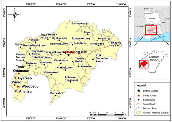 This study focuses on the Atwima Mponua District (AMD) (~1883.2 km2) in the Ashanti region of Ghana. The district has a bimodal rainfall pattern and is located in the forest agro-ecological zone, which supports cocoa and other tree crop production. Cocoa farmers grow additional crops such as oil palm, coconut, cereals, legumes and vegetables. Five communities were selected for this study, including Tano Odumase, Gyereso, Pasro, Worebegu, and Anansu (Figure 2). Smallholder cocoa farming is a significant economic activity in the Atwima Mponua District; about 66% of the economically active population is engaged in agriculture [25]. There are two primary cocoa farming systems in the study area: organic and conventional, with over 95% of farmers practising the latter.