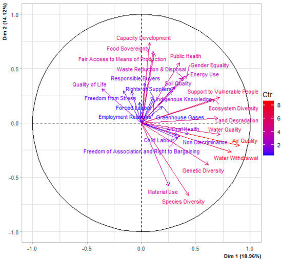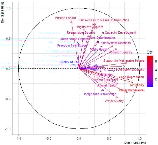 The analysis of the conventional farming system showed that the variables “air quality”, “water withdrawal”, “water quality”, “soil quality”, “land degradation”, “ecosystem diversity”, and “support to vulnerable people” contributed the most to the total variance (Table S3). Previous research [43,44] has also highlighted that supporting vulnerable people in the conventional farming system leads to reduced land degradation and improved soil quality, which are environmental benefits.
