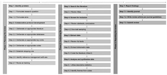 The generic literature review often follows three phases and eight steps [99,100]. These include the following: (i) planning, constituted by problem formulation, followed by protocol development and validation; (ii) conducting the review by searching for the literature, screening for inclusion, assessing quality, and extracting, analyzing, and synthesizing data; and (iii) reporting findings. After due consideration, a three-phase, seven-stage approach was proposed for this study, illustrated by Figure 2.