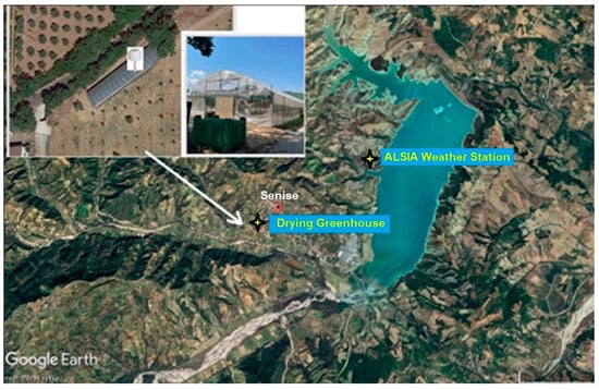For monitoring outdoor agrometeorological variables, the Senise ALSIA weather station, located nearest to the greenhouse, was utilized, while temperature and humidity sensors were set up inside the drying greenhouse, approximately in the center of the structure (see Figure 1). The 2 yellow placeholders in Figure 1 indicate the positions of the weather stations.