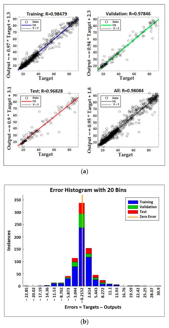 (a) Scatter plots of training, validation, and test dataset with the related root square errors of the neural network prediction of humidity and temperature conditions inside the drying structure. (b) Histogram of errors of predicted and measured air relative humidity.