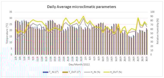 Figure 4 shows the average daily values of temperature and relative humidity, inside and outside the greenhouse in the period from 1 August to 30 September 2022. The pepper began to be placed in the greenhouse for drying on 17 August, as shown in Table 1.