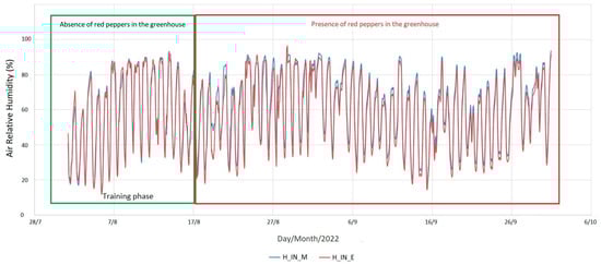 The measured (H_IN_M, blue line) and estimated (H_IN_E, red line) relative humidity inside the greenhouse. The graph shows the data starting from 1 August to 30 September; the period in which the neural network was tested is highlighted in green, while the period in which the peppers were present in the greenhouse is highlighted in red.