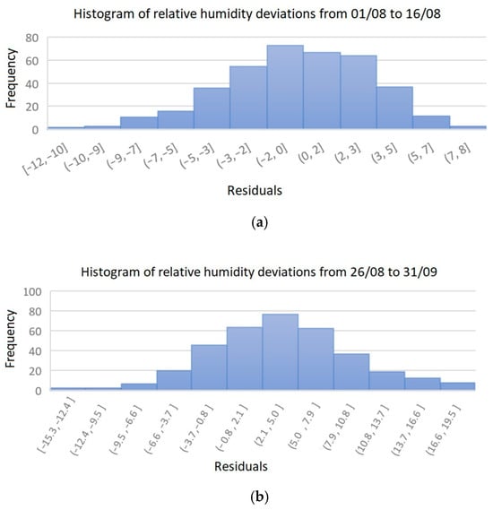 To highlight the significance of these differences, a targeted analysis was conducted [33]. Figure 6 shows the histograms of the differences between the estimated and measured relative humidity, relating to the period of absence of product (Figure 6a) in the greenhouse and to the following two weeks in which the peppers were introduced in the greenhouse (Figure 6b). While in Figure 6a, the distribution of deviations is almost symmetrical around the value 0, in the other graph, it moves toward positive values.