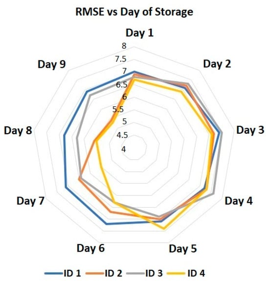 Figure 7 shows the RMSE of the estimated and measured air relative humidity in the day following the placement of the red pepper in the drying greenhouse at four different times in the 2022 study year (as reported in Table 1).