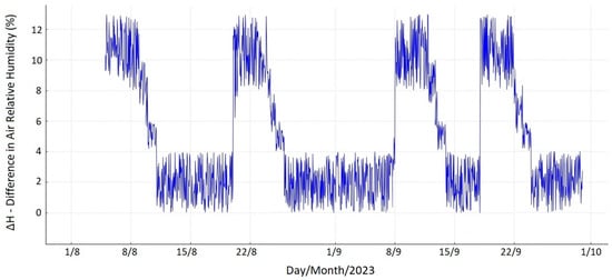 Figure 9 shows the graph of residuals between the estimated air relative humidity inside the greenhouse in the presence and absence of red peppers (ΔH), from 5 August to 30 September 2023. The outliers were removed from the graph.