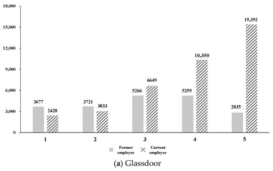 The distribution of job satisfaction ratings on a 5-point scale collected from Glassdoor and Jobplanet is shown in Figure 2. The overall average job satisfaction rating on Glassdoor was 3.56, while on Jobplanet it was 2.91. Therefore, it was found that the overall average job satisfaction rating on Glassdoor is higher. In addition, the average job satisfaction rating for former employees on Glassdoor was 2.99, while for current employees it was 3.88. On Jobplanet, the average job satisfaction rating for former employees was 2.8, and for current employees it was 3.08. Therefore, it was found that both Glassdoor and Jobplanet have higher average job satisfaction ratings for current employees compared to former employees. This is an expected outcome, as former employees, who left or resigned due to low job satisfaction, tend to rate their companies lower than current employees. However, the difference in satisfaction between former and current employees is more pronounced in the United States than in South Korea.