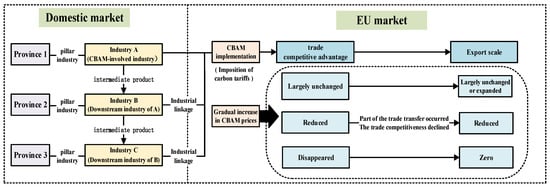 Industry C, as the downstream sector of Industry B, is similarly influenced by the cascading effects of CBAM. The implementation of CBAM alters the trade competitiveness of Industry A in Province 1 and Industry B in Province 2, which, in turn, affects the trade competitiveness of Industry C in Province 3 within the EU market. If Industry C’s trade competitiveness remains relatively stable, its export volume to the EU will either remain unchanged or increase. However, as CBAM prices escalate, Industry C’s competitive advantage in the EU market diminishes, prompting a partial shift of its market share to other countries and leading to trade diversion. This decline in competitiveness reduces Industry C’s export volume to the EU [29,30]. If CBAM prices continue to rise, Industry C’s trade competitiveness in the EU market will disappear entirely, causing it to cease exports to the EU.