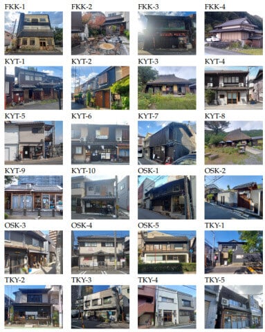 Purposive sampling of field surveys was conducted across four regions in Japan with the highest concentration of vacant houses: Fukuoka, Kyoto, Osaka, and Tokyo. These case study locations were initially identified through a desk study, with additional cases discovered during the field surveys. The number of case studies varied by region: 4 in Fukuoka, 10 in Kyoto, 5 in Osaka, and 5 in Tokyo. Figure 1 shows the photos of the additional cases through the field study with the detailed information provided in Table 1.