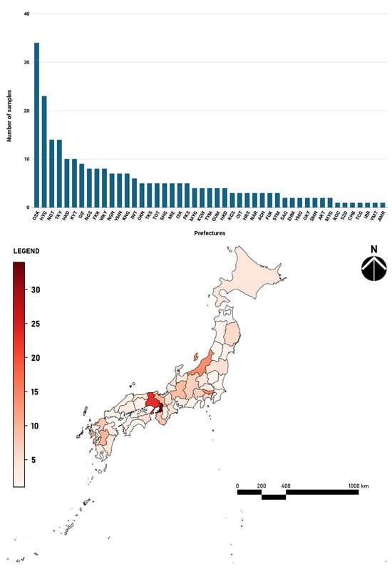 Sampling distribution of the number of vacant houses in each prefecture. Top: In the form of bar chart, the prefecture abbreviation is shown in the horizontal axis against the number of vacant house samples in the prefecture. Bottom: The same data are presented in the form of a map to better illustrate the location of prefectures with their number of vacant house samples. The darker the color, the more vacant house samples are located in that prefecture.