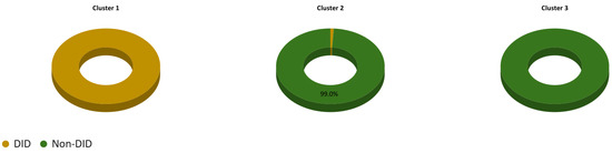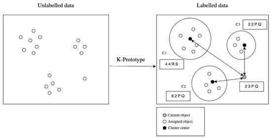 Figure 3 illustrates the following procedures. Suppose that we have unlabeled data that are clustered into three clusters by the K-prototype clustering algorithm, namely , , and . In the example, we have four features containing two categorical features and two numerical features. The centers for , , and , respectively, are , , and . Now, we have a new object that is not clustered yet. The process to cluster the new object is as follows. First, the distance of the categorical data is calculated by using Equation (2):