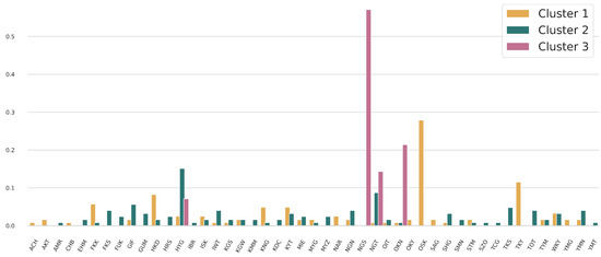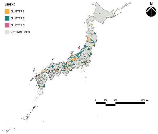Following the procedures described in Figure 3, the clustering results are presented in Figure 6. The areas assigned to clusters 1, 2, and 3 are represented by orange, green, and magenta colors, respectively, while gray indicates areas not included in the sampling. The clustering process resulted in 126, 122, and 14 areas for clusters 1, 2, and 3, respectively. As observed on the map, the areas in cluster 1 are distributed relatively evenly across Japan, followed by those in cluster 2. In contrast, the areas in cluster 3 are concentrated on small islands separately from the main islands of Japan.