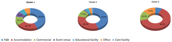 The next characteristic is derived from the new functional variable of the buildings, as illustrated in Figure 8. The cluster analysis reveals that adaptive reuse in clusters 1 and 2 is predominantly for the food and beverage sector, accounting for 42.6% and 44.4%, respectively. This is followed, in the same order, by uses for accommodation, commercial purposes, event venues, educational facilities, offices, and care facilities. Notably, cluster 2 shows a significantly higher percentage of adaptive reuse for the accommodation sector compared to cluster 1, highlighting distinct differences between the two clusters. In contrast, cluster 3 stands out with adaptive reuse overwhelmingly concentrated in the accommodation sector, comprising 64.3% of its total, while the remaining reuse is limited to commercial, office, and care facility purposes.