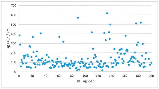 For a diverse fleet, a coefficient of variation exceeding 30% is expected, aligning with the inherent heterogeneity of the SAAM Towage fleet. However, analyzing the statistical measures and the generated graph highlights the indicator’s high sensitivity to input data, leading to significant variations. While only a tiny proportion of tugboats exceed 200 kg CO2e/km, most values cluster around 100 kg CO2e/km, demonstrating a generalized trend toward lower carbon intensity levels within the fleet. Moreover, in certain tugboats, the median and arithmetic mean fail to serve as representative measures.