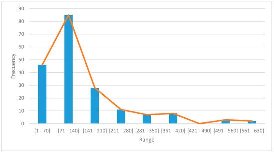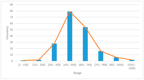 The distribution of results is presented in Figure 8, where the frequency polygon shows a bell-shaped tendency, similar to the previous case. This shape reflects the expected variability for an indicator of this nature, with a symmetric distribution of the results’ dispersion. This is evidenced in both Figure 8 and the results of Table 3, specifically in the proximity between the median and the arithmetic mean values.