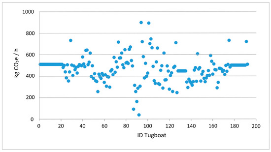 It is essential to highlight that Figure 5 reveals a group of tugboats forming a constant line. This occurs because the three countries stored fuel consumption and operational hours data nationally rather than individually for each tugboat. For this analysis, these values were evenly distributed among the tugboats comprising the fleet in each respective country. As a result, no data dispersion is observed for these countries.