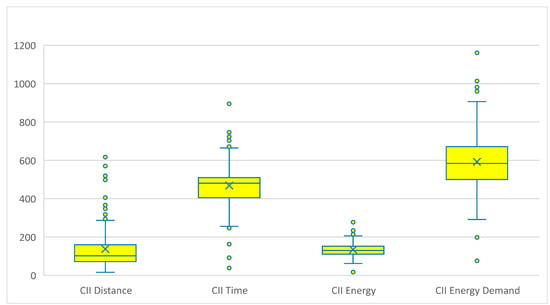 Figure 11 allows for a simultaneous comparison of the four indicators, although it is essential to note that they do not share the same units of measurement. In this representation, CII Distance shows only upper outliers, with a notable discrepancy between the median and the arithmetic mean and asymmetrical quartiles. On the other hand, CII Time shows an improvement in distribution, reflected in the whiskers and the presence of lower and upper outliers; however, the distribution of the quartiles remains asymmetrical.