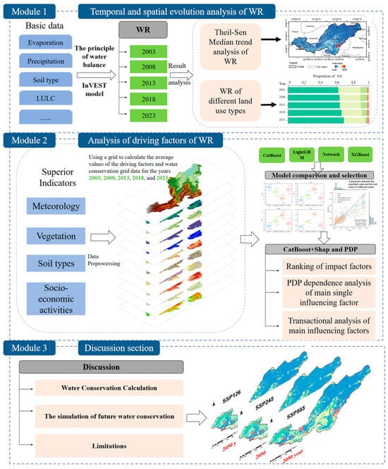 The framework of this paper is divided into three parts. In the first part, the dependent variable water conservation is obtained through InVEST model. The second part is divided into three sections: 1. screening impact factors and data processing; 2. after comparing multiple models, the CatBoost model is selected as the basic model; 3. a visual analysis of the nonlinear relationship between environmental factors and oxygen content of water sources in the basin by SHAP and PDP. The third part predicts the oxygen content of water sources in 2050 based on the analysis of driving factors.