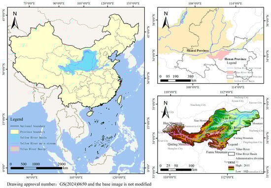The Yiluo River Basin is located at the boundary between the middle and lower reaches of the Yellow River, spanning the second and third terrain steps of China. The terrain descends from west to east with steep northern slopes and gentle southern slopes, having an elevation difference of 2543.6 m. The complex topography comprises 52.4% mountains, 39.7% loess hills, and 7.9% alluvial plains (valleys). Mountain ranges, including Mount Hua, Mount Xiao, Qinling Mountains, Xiong’er Mountains, and Funiu Mountains, extend from north to south. The basin has a humid to semi-humid continental monsoon climate, characterized by hot, rainy summers and cold, snowy winters, with an average annual precipitation of approximately 660 mm []. The basin spans the western Henan and eastern Shaanxi provinces and is bounded by Mount Hua and Mount Xiao to the north, with the Funiu Mountains separating it from the Yangtze River system to the south, and it is adjacent to Waifang Mountain and the Huai River to the east, covering an area of approximately 18,600 square kilometers. The Yiluo River is formed by the confluence of the Luo River and Yi River, with the Luo River being the main stem originating from Mupengou in Luonan City, Shaanxi Province (or the southern foot of Mount Hua), and the Yi River originating from the Xiong’er Mountains. The two rivers converge in the Luoyang Plain before flowing into the Yellow River. Therefore, the Yiluo River Basin possesses unique natural conditions and research advantages for studying water conservation capacity (Figure 2).