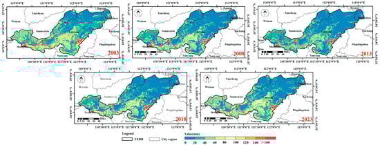 Spatial distributions of the water conservation in the Yiluo River Basin (2003, 2008, 2013, 2018, and 2023).