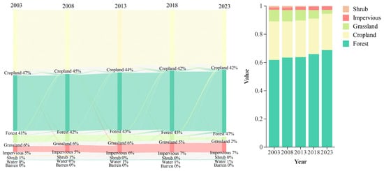 Transitions in land use types and proportions of water conservation in the Yiluo River Basin (2003, 2008, 2013, 2018 and 2023).