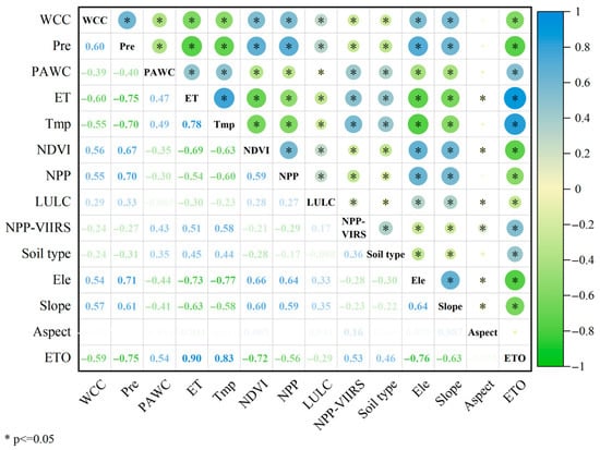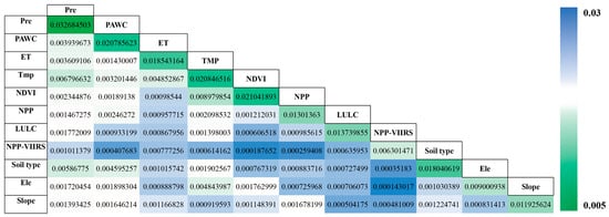 This study analyzed 13 key impact factors across topographical, soil, meteorological, and socioeconomic dimensions. Although nonlinear machine learning models do not require traditional correlation analysis, Spearman correlation analysis was conducted to enhance model accuracy and interpretability (Figure 6). Generally, correlation coefficients exceeding 0.8 indicate potential collinearity. After eliminating variables with excessively high or low correlation coefficients, crop evapotranspiration and aspect were excluded, leaving 11 variables for analysis.