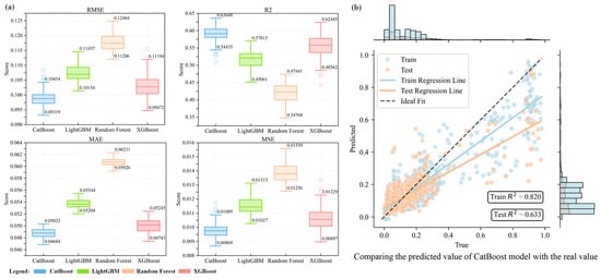 Comparing Models and Selecting the Optimal Model. (a) Boxplots for different models on R2, RMSE, MSE, and MAE. (b) As the optimal model, actboost is based on the scatter plot and fitting line of the comparison between the simulation results and the observation results of a single test data set.