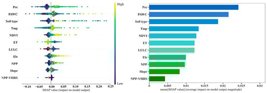 Precipitation SHAP values mainly range between 0.01 to 0.03 and −0.01 to −0.03, with maximum values approaching 0.02, indicating that increased precipitation helps improve water conservation. Soil type SHAP values are widely distributed, reaching up to 0.3, showing a significant impact on water conservation capacity. Vegetation coverage SHAP values are evenly distributed between 0.00 and 0.05, suggesting that higher vegetation coverage leads to greater water conservation capacity. The positive effect of the high proportion of forest land in the Yiluo River Basin on water conservation is reflected through the positive impact of land use. Temperature SHAP values concentrate between 0 and 0.02, showing a minimal contribution to water retention. Evapotranspiration SHAP values cluster in the −0.01 to −0.02 range, indicating that increased evaporation reduces water conservation. The nighttime light index reflects human activity intensity, with its negative effect showing reduced water conservation in areas of intensive human activity, reflecting the negative impact of human activities on water conservation [].