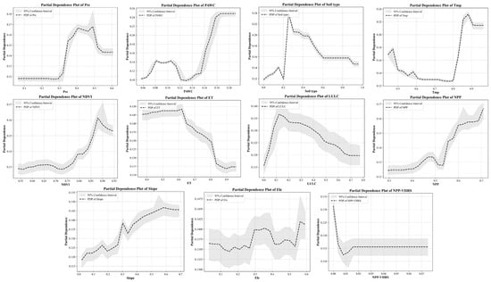 PDP analysis places more emphasis on the analysis of local features and can perform marginal analysis on the interaction of univariate or bivariate variables []. PDP analysis demonstrates the impact of one or two feature variables on model prediction results, showing approximately linear, monotonic, or more complex relationships, and clearly indicating positive or negative correlations between independent and dependent variables. By marginalizing other features, PDP analysis reveals relationships between features of interest and prediction results, analyzing the marginal effects of independent variables on dependent variables. Compared to SHAP’s global or local interpretations, PDP analysis focuses more on local variable interpretation. Therefore, this study employs PDPs (Partial Dependence Plots) to complement the local interpretation aspects of SHAP analysis. The specific formula is []