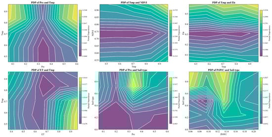 - SHAP and PDP analysis and quantification of driving factors showed that annual rainfall, plant water content, and soil type are the main factors affecting water conservation. Through the single-factor PDP analysis, soil type in particular showed a complex nonlinear effect on water conservation, as different soil types vary in water retention and permeability capabilities. Loose soil texture enhances permeability and adsorption capacity, improving water conservation function; conversely, dense soil impedes water retention. These factors show nonlinear relationships with water conservation. PDP analysis for two-factor interaction detection also found that temperature shows the most significant interactive effects with precipitation, elevation, normalized vegetation index, and evapotranspiration, displaying similar trends.