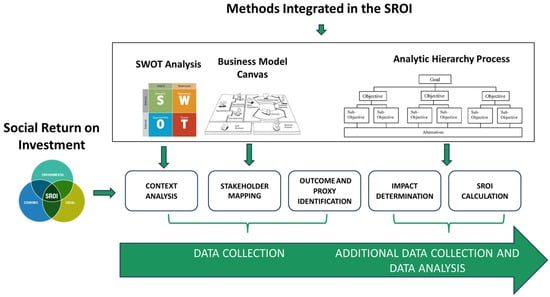 The Social Return on Investment (SROI), which constitutes the main method of our approach, was used to quantify the social, environmental, and economic impacts generated by social farming as it is a methodology aimed at quantifying a broader “value” expressed in purely economic or financial terms [40]: using outcomes, indicators, and financial proxies to measure social and environmental benefits, it allows the social and environmental components to be expressed in monetary terms. By incorporating these benefits into the analysis, this approach aims to enhance both a reduction in social inequalities and environmental degradation and an improvement in the well-being of individuals resulting from a certain investment.