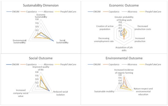 Variations in the weights assigned to individual outcomes within the sustainability components can be attributed to the type of project leader. For example, organizations like Engim, which has a tradition in social and labor inclusion pathways outside the agricultural sector, place significant emphasis on economic outcomes with strong social implications, such as the creation of an active population and the decrease in the unemployment rate. On the other hand, actors like Agricoltura Capodarco and Alicenova, which have a strong agricultural component and long-established networks with local farms, prioritize outcomes that directly benefit them, such as a decrease in production costs. This difference is also reflected in the environmental sustainability dimension. Projects with extensive collaboration with local farms tend to assign greater weight to increase organic farming, whereas organizations like PeopleTakeCare, that have spent as much on training users, emphasize teaching respect for nature and the environment.