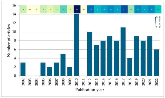 Distribution and visualization of the number of marine zoning scientific articles related to conservation by publication year (2002–2022) based on results from a Scopus literature review. Heatmap visualization—darker shades indicating years of higher publication activity.